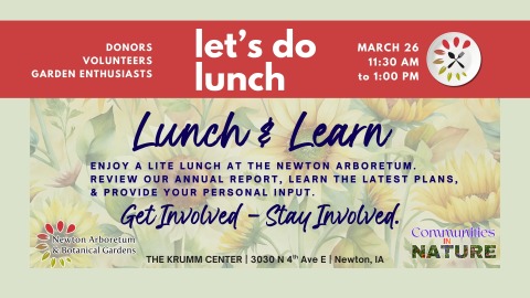 Join us March 26th for an opportunity to learn more about what we do here at the Newton Arboretum & Botanical Gardens. Share a lite lunch with NABG Board members as we review our annual report, discuss what we did last year, share what we have planned for this year and give you the opportunity to share your personal input! We are excited to share this information with our community and learn more about your thoughts as well!